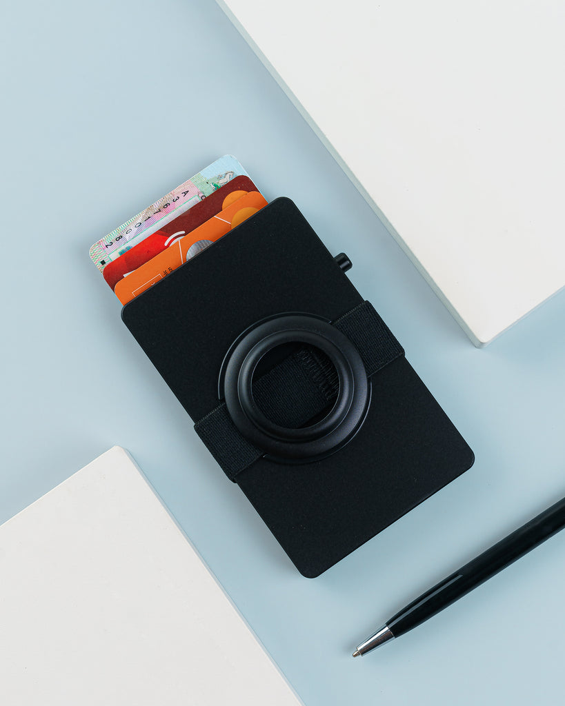 Introducing our latest addition: The Smart Aluminum Card Holder. This piece is a minimalist’s dream, offering a compact design capable of securely holding up to seven cards. It features an additional outer compartment, secured by an elastic band, which also ingeniously serves as an AirTag holder.